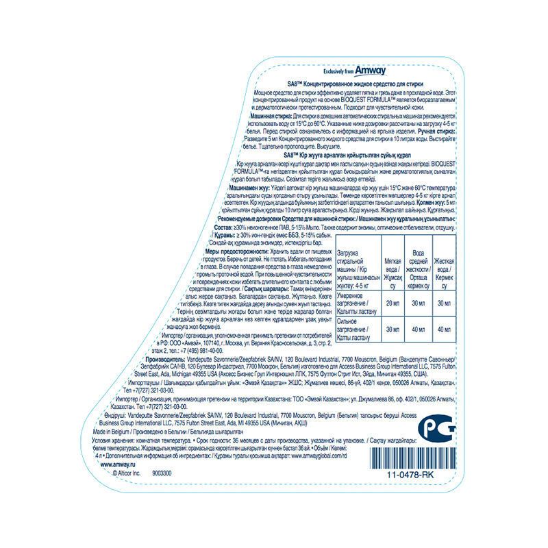 SA8 Концентрированное жидкое средство для стирки, 4 л.